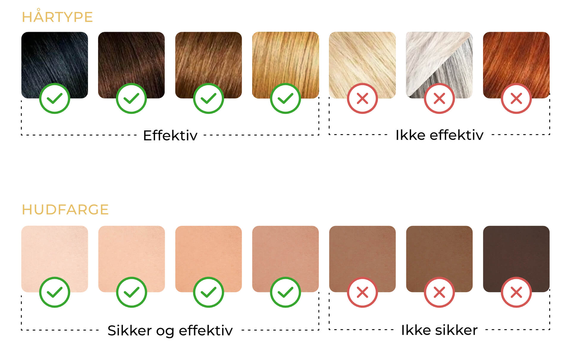 Hos personer med mørkere hud er det risiko for forbrenning. IPL fungerer ikke på svært lyst hår, da melaninnivået ikke er høyt nok. Rødt hår har dessuten en type melanin kalt feomelanin som ikke absorberer energien fra IPL, og derfor fungerer ikke behandlingen på rødt hår. Se diagrammene nedenfor for å vurdere om IPL vil kunne fjerne hårveksten din og hvilket effektnivå du bør bruke med Comforth IPL.