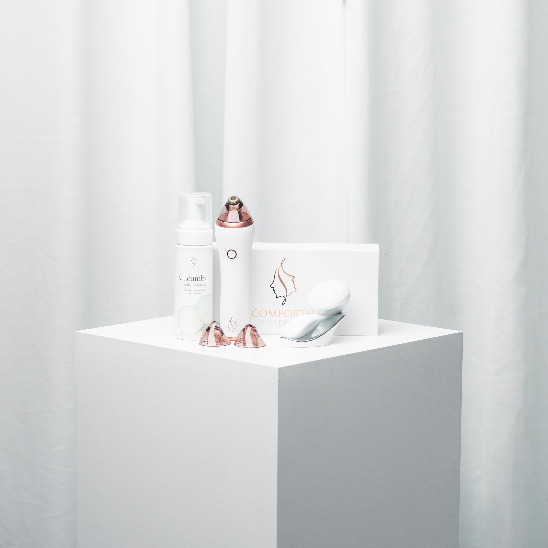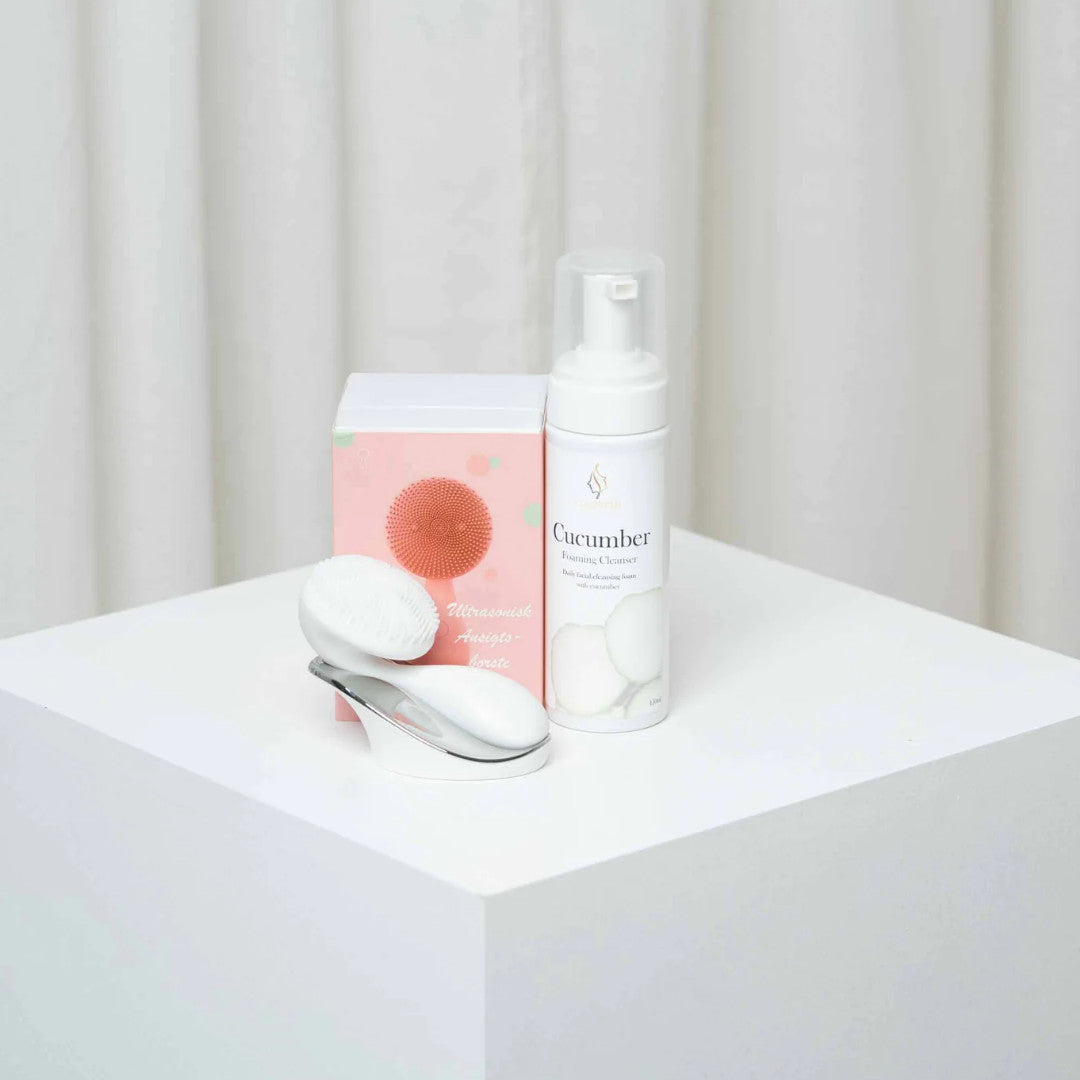 Comforth Cleansing Combo inneholder først og fremst Comforth Cleanser – Ultrasonisk Ansiktsbørste, som sammen med Comforth Cucumber Cleansing Foam dyprenser huden og fjerner smuss, olje og sminkerester. Den ultrasoniske teknologien sikrer en skånsom, men grundig rens som forbereder huden for de neste trinnene i pleien.