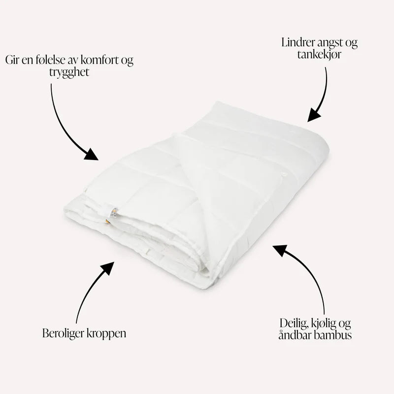 Vektdynen bruker dyptrykkstimulering for å gi en beroligende følelse som hjelper til med å redusere stress og skape trygghet. Sovemasken blokkerer alt lys og skaper en mørk og avslappende atmosfære, mens det lette trykket fra masken gir ekstra avslapning. Det medfølgende bambustrekket gjør dynen enda mykere og bidrar til en temperaturregulerende og allergivennlig søvnopplevelse.