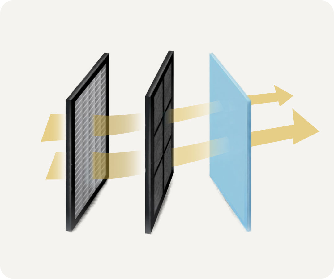 HEPA-filteret fanger opp 99,95 % av partikler helt ned til 0,1 mikrometer. Et lag med aktivt karbon fjerner også lukt og gasser, inkludert VOC.