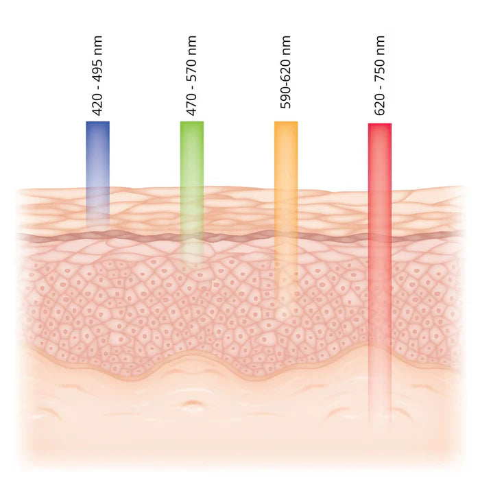 - Blått lys (450nm): Bekjemper aknebakterier og renser huden.