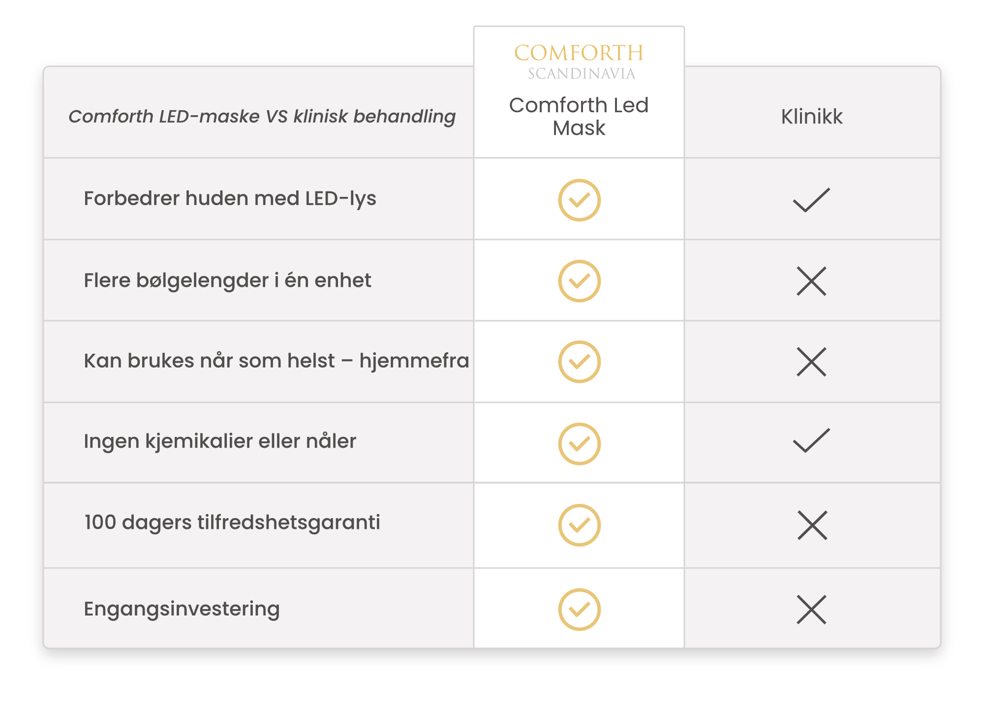 Klinisk lysterapi krever ofte mange behandlinger fordelt over uker eller måneder – og koster typisk 500–1.200 kr per gang. I tillegg må du booke time, dra dit og ofte betale ekstra for kombinerte lysspekter. Med Comforth Light Pro får du samme type behandling med fem forskjellige lysfunksjoner – hjemme i din egen sofa. Én engangsbetaling gir deg ubegrenset tilgang til hudforbedring, uten å gå på kompromiss med kvaliteten.