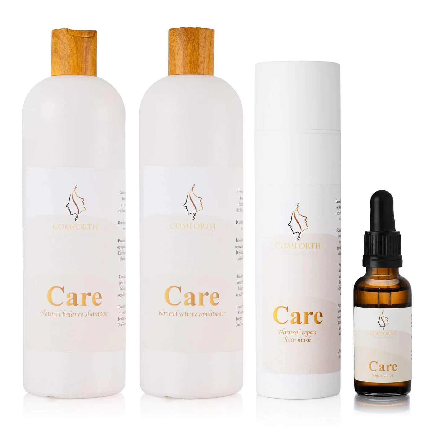 Gi håret ditt den ultimate pleien med Comforths Hair Care-pakke. I denne pakken får du alt du trenger for å holde håret ditt sunt og vakkert. Pakken inneholder sjampo og balsam som du kan bruke hver gang du vasker håret. Hårmasken gir håret ditt intensiv pleie og kan brukes 1-2 ganger i uken. Vår populære arganolje kan brukes etter hårvask eller etter behov.